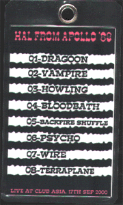 2000年9月17日。その夜はHAL史上前代未聞のたった一曲だけのライブになりました。HALを観に来てくれたみんな、本当にごめんね。君たちには本当に可哀想なことをしてしまった。まずはとにかく謝りたい。そしてあの日起きた事を話して置かなくてはならないと思う。あのイベントはHAL presentsではなく、ゲストとしてHALは招かれて出演したんだ。 6バンド出演、そしてclub asiaでは22:00以降は次のイベントが既にブッキングされていた。当日HALは12:00に会場入りし、リハーサルを最初にやり、その後開場時間までを会場周辺で待っていた。開演が遅れ、各バンドは少しずつの時間の狂いを伴いながら全てのタイムテーブルが押していた。その誤差は重なり、当初21:00予定だったHALの演奏開始時間を過ぎても3つ目くらいのバンドがアクトをしている状況だった思う。 |